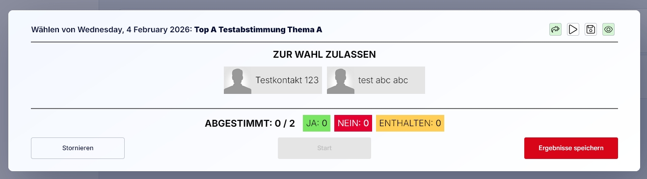• Anzeige von Abstimmungsgegenstand, stimmberechtigten Teilnehmern und Ergebnissen während der Sitzung.